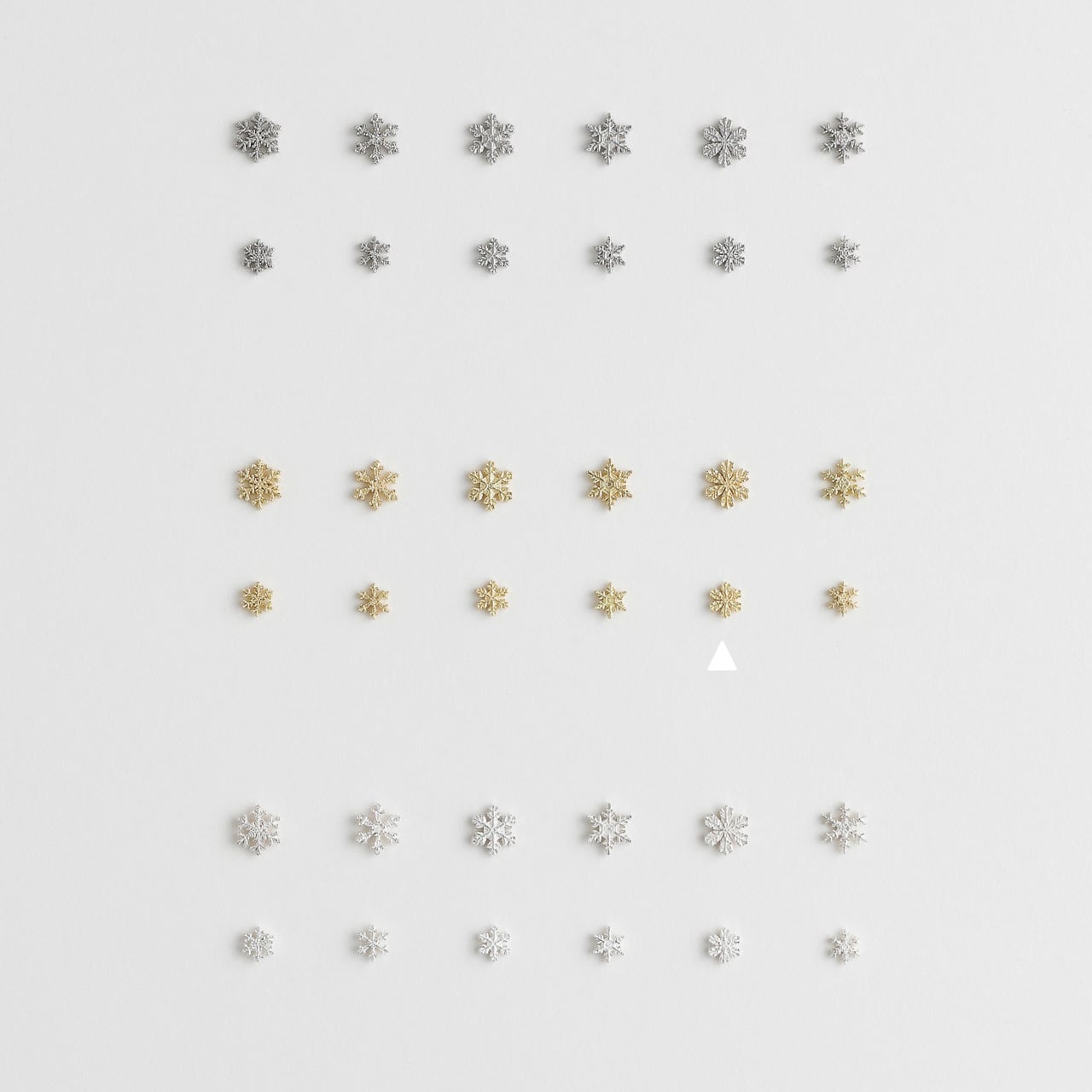 雪の結晶については、いつか作りたいと昔から思っていました。ただその繊細で複雑な構造をどこまで緻密に再現できるのだろう・・という気持ちもあり、時が経ってしまっていたのです。ところが2024年、干支オブジェ「へび」製作のために細かい作業を続けていたところ今なら雪の結晶に挑戦できるのではという気持ちが私達の中にふつふつとわいてきました。実際に原型製作をはじめてからは様々な試行錯誤を重ね、最初の試作から数えると17種の雪結晶を作りその中から最終的に6種の形を決定。表だけでなく裏面も極限まで細かいテクスチャーを彫刻し、(途中で、雪の結晶にはたして表と裏は存在するのか?という問いにもぶつかり様々な資料を調べました→結果的に「表と裏は存在する」という推定のもと、全てのアイテムの表面と裏面を微妙に変えて彫刻しています)私達が持っていた雪結晶のはかなく精緻なイメージを、何とか表現することができたのではと思っています。