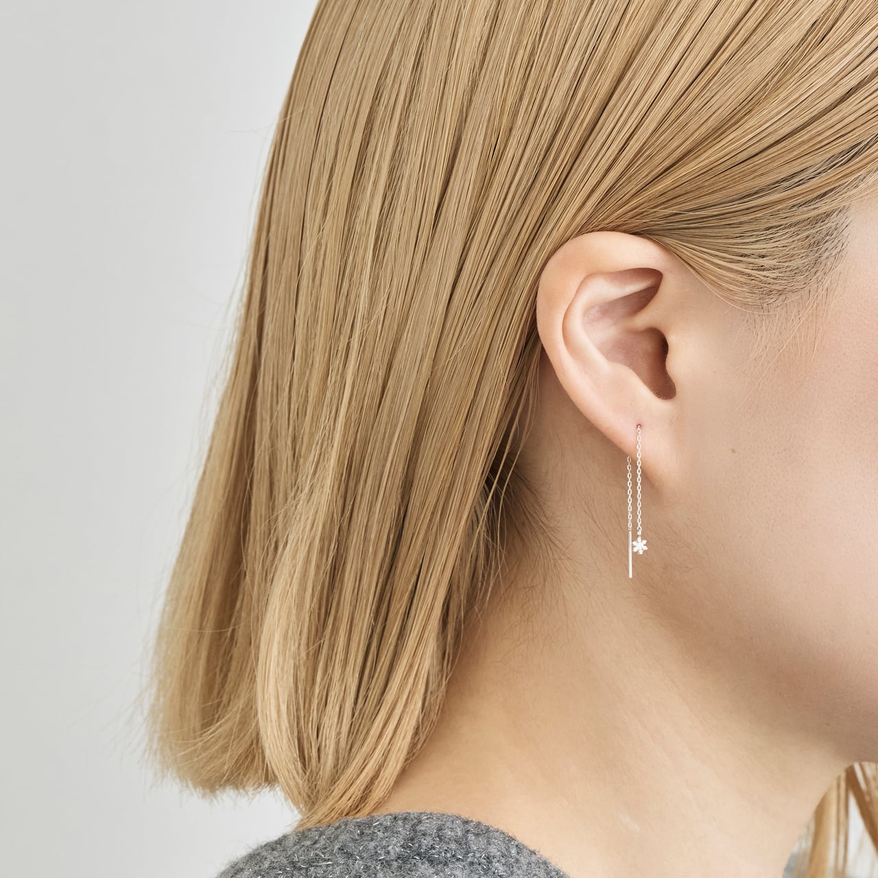 モチーフ部分のサイズは約4ミリとかなり小さいですが、細部までつきつめた繊細なテクスチャーを両面に施しています。耳に着けるとチェーンが揺れ、はらはらと雪が降る静かな情景をイメージしていただけると思います。