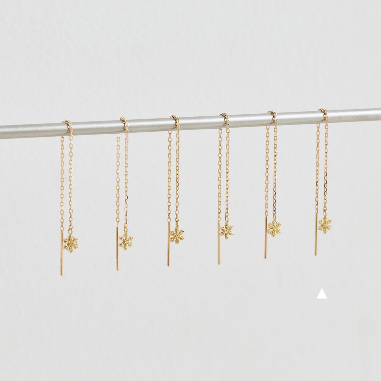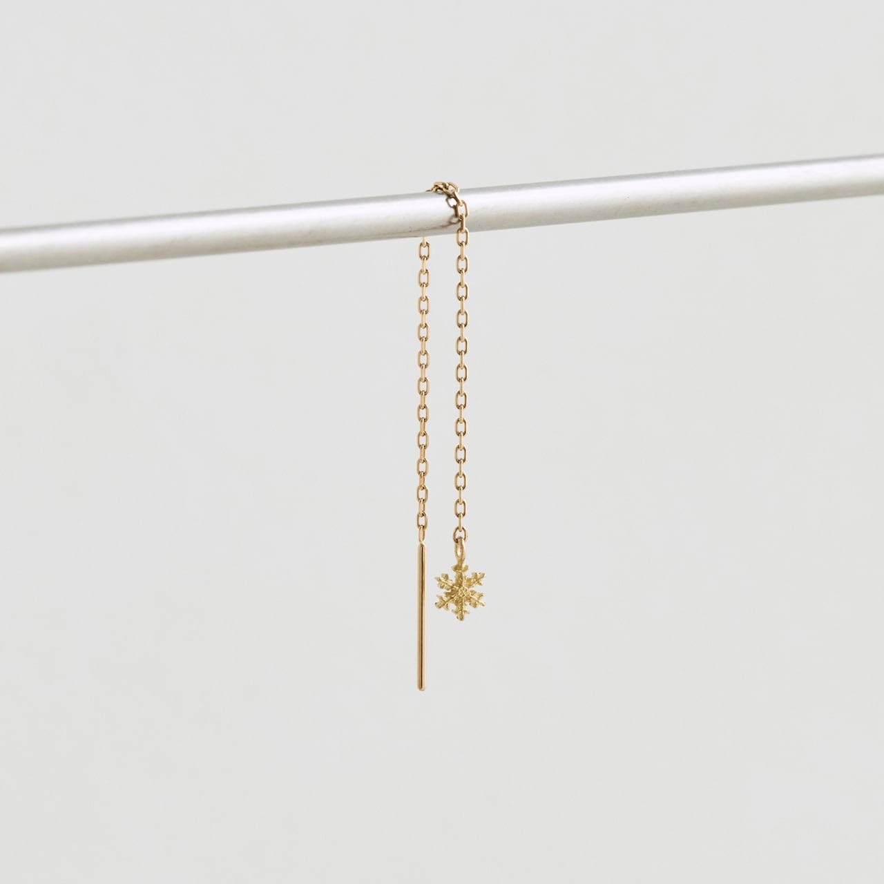 モチーフ部分のサイズは約4ミリとかなり小さいですが、細部までつきつめた繊細なテクスチャーを両面に施しています。耳に着けるとチェーンが揺れ、はらはらと雪が降る静かな情景をイメージしていただけると思います。