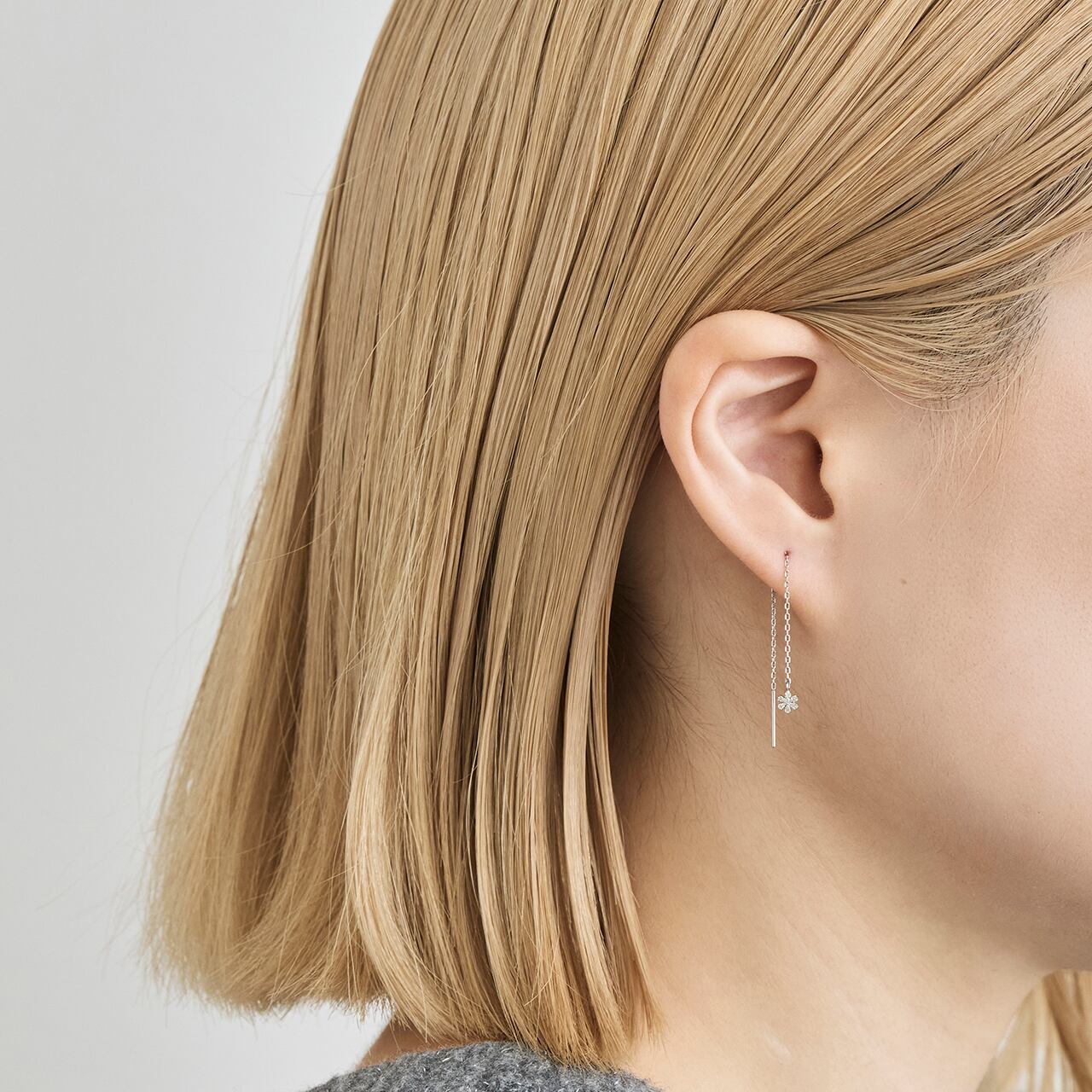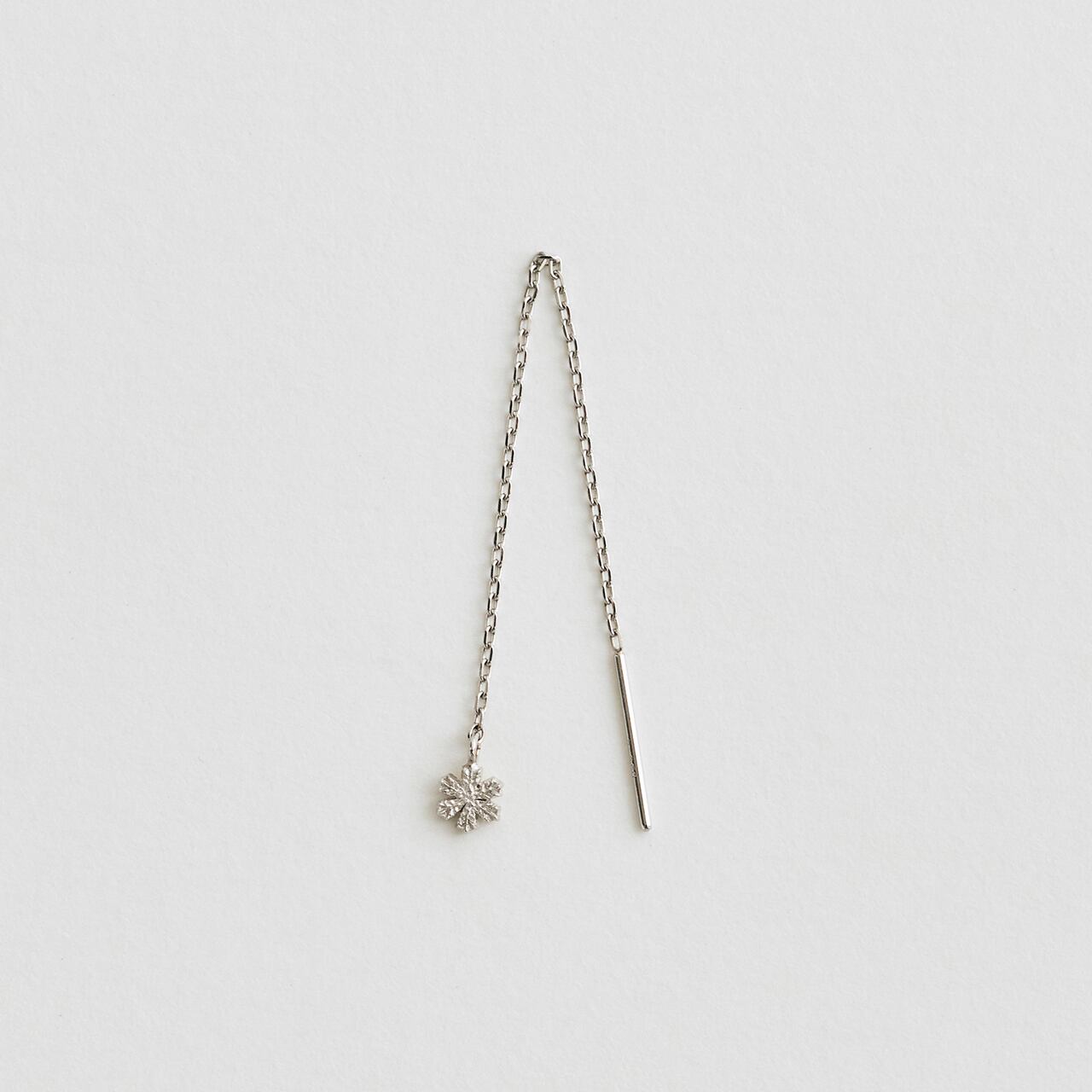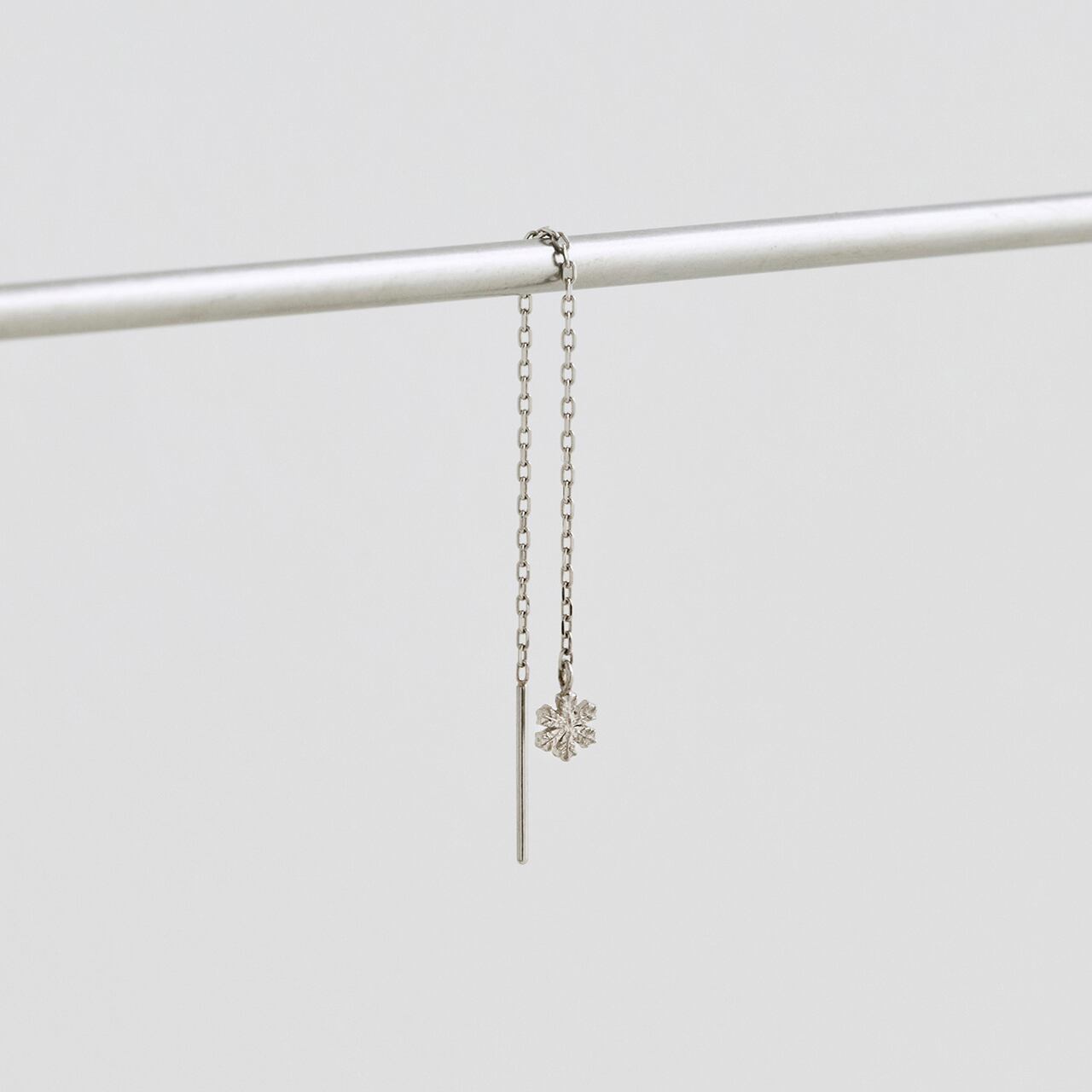 モチーフ部分のサイズは約4ミリとかなり小さいですが、細部までつきつめた繊細なテクスチャーを両面に施しています。耳に着けるとチェーンが揺れ、はらはらと雪が降る静かな情景をイメージしていただけると思います。