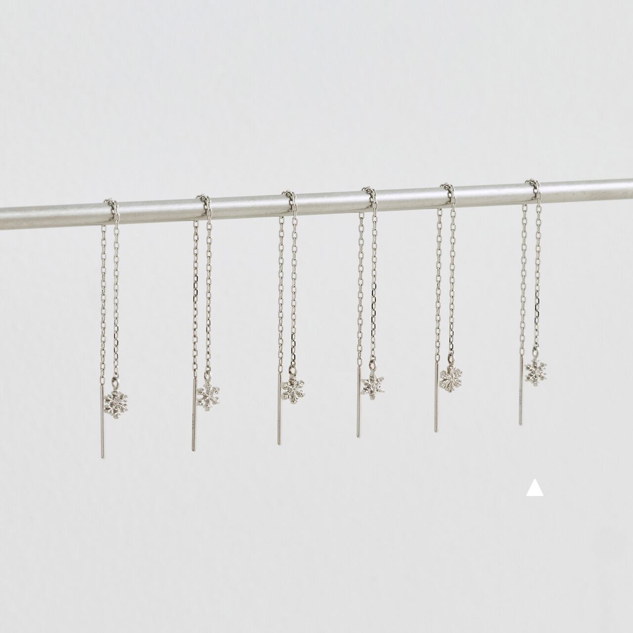 モチーフ部分のサイズは約4ミリとかなり小さいですが、細部までつきつめた繊細なテクスチャーを両面に施しています。耳に着けるとチェーンが揺れ、はらはらと雪が降る静かな情景をイメージしていただけると思います。