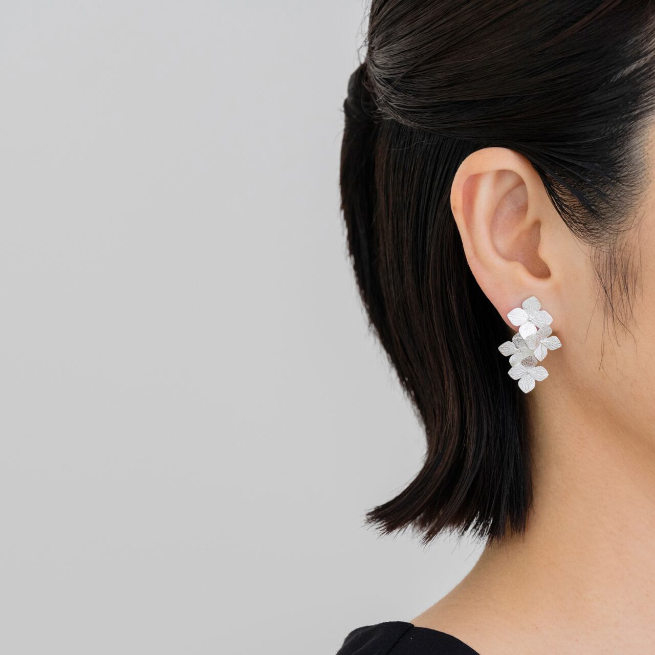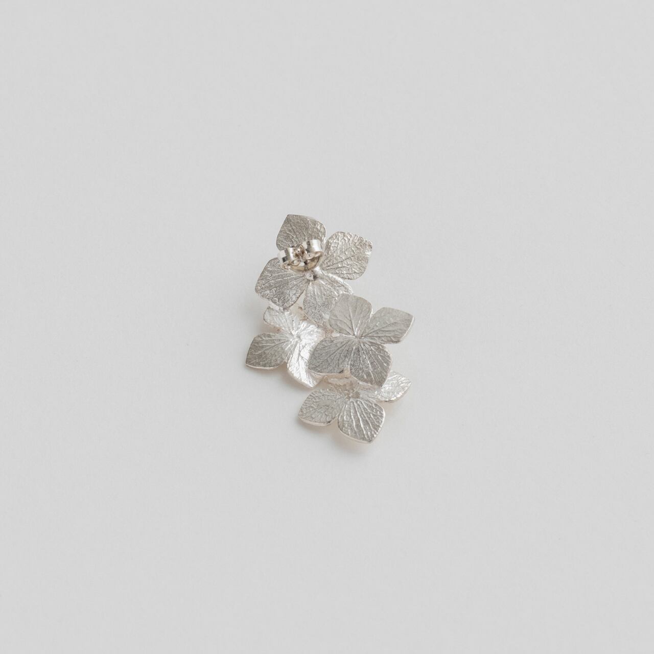 梅雨の時期に街を彩る紫陽花をモチーフにしたピアス。質感は実物から写し取り、表・裏両面の細部のテクスチャーまで再現しています。2019年に発表したシリーズですが、数年前から梅雨の季節になるたびにジュエリーとしてかたちにできないかどうか考えていました。萼片が多数集まって丸く一つに見えるのがこの植物の特徴と言えますが、塊の中の個々を切り取ることで全体としての紫陽花らしさを表現できたら、と思ってつくりました。