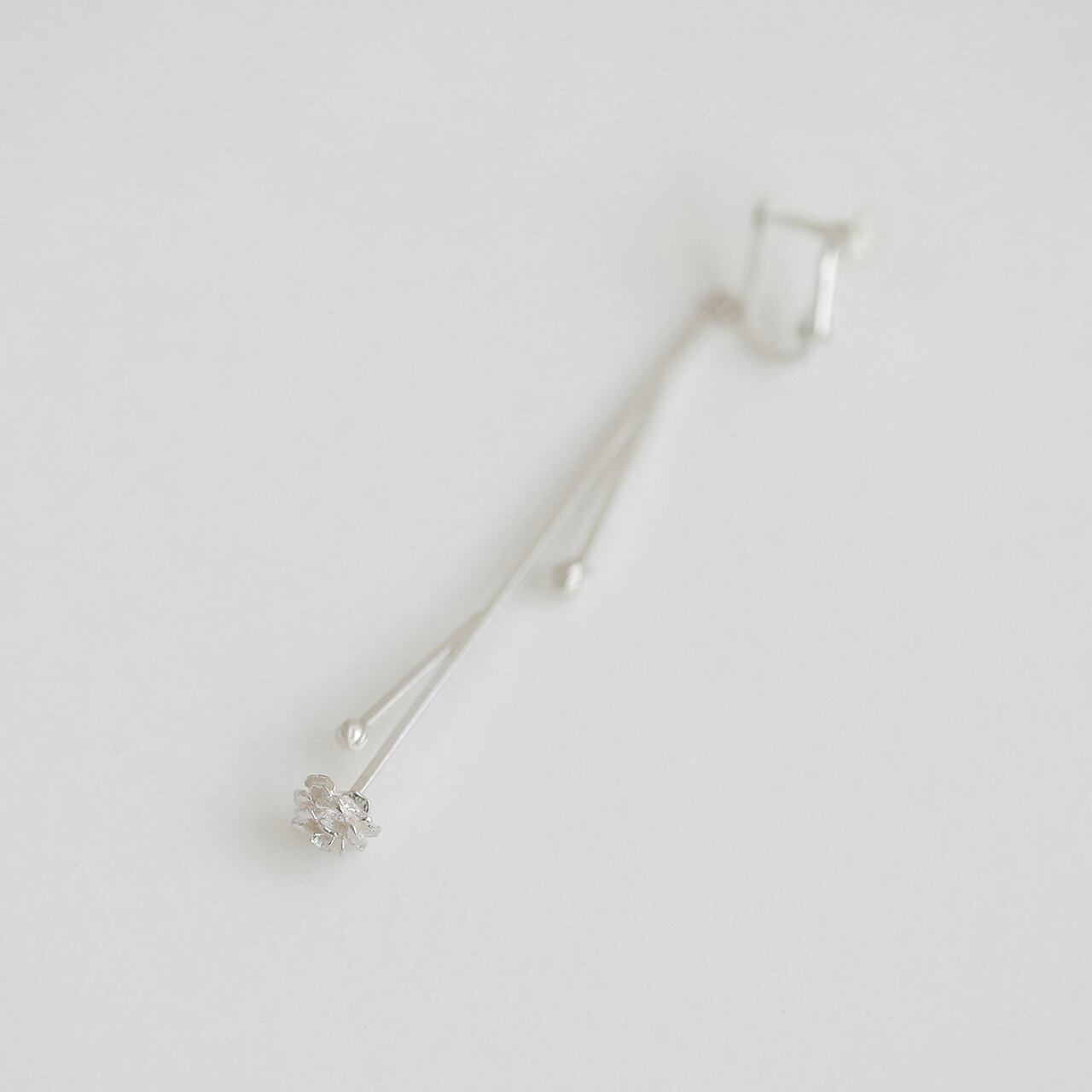 このイヤリングは茎を表現した角線の先にかすみ草の花が一つとつぼみが二つついた揺れるタイプ。枝分かれした部分の1本目が前から見て右にくる形です。