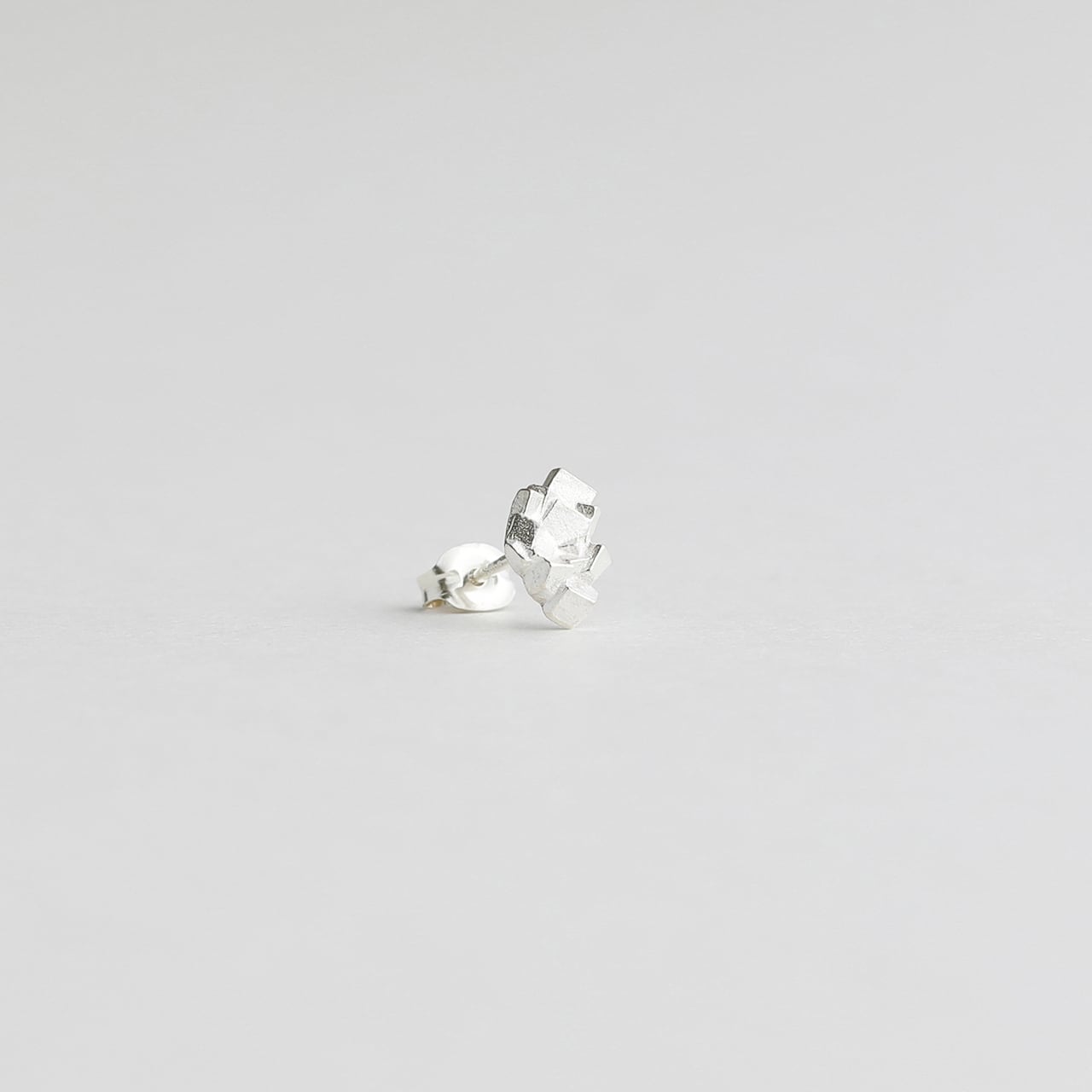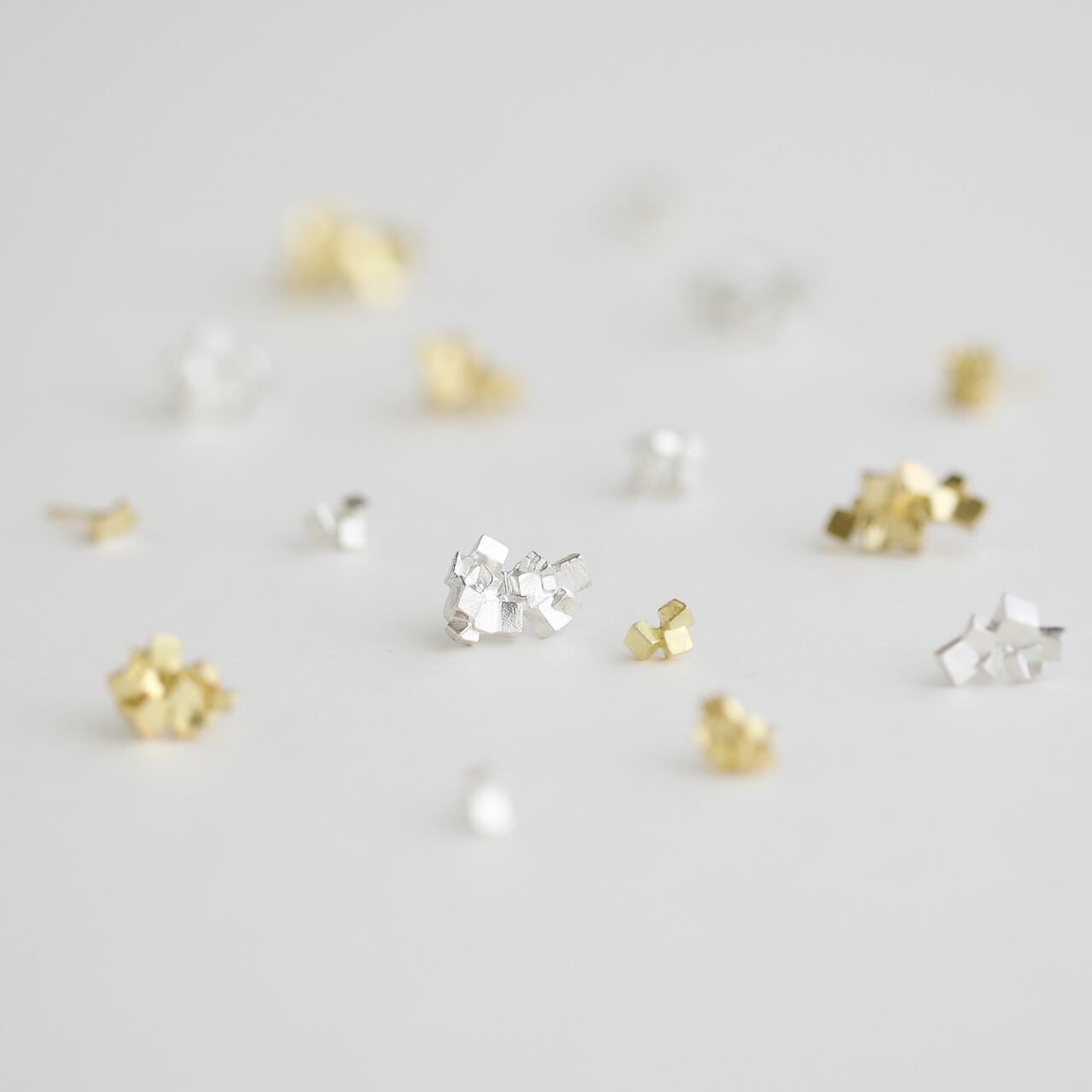 鉱物の結晶がモチーフのピアス。黄鉄鉱(パイライト)をイメージしました。最初にこのシリーズを製作した時は、黄鉄鉱の結晶構造を実際に観察しつつ、耳に着けた時のバランスを考えながら一つずつ原型をつくっていきました。