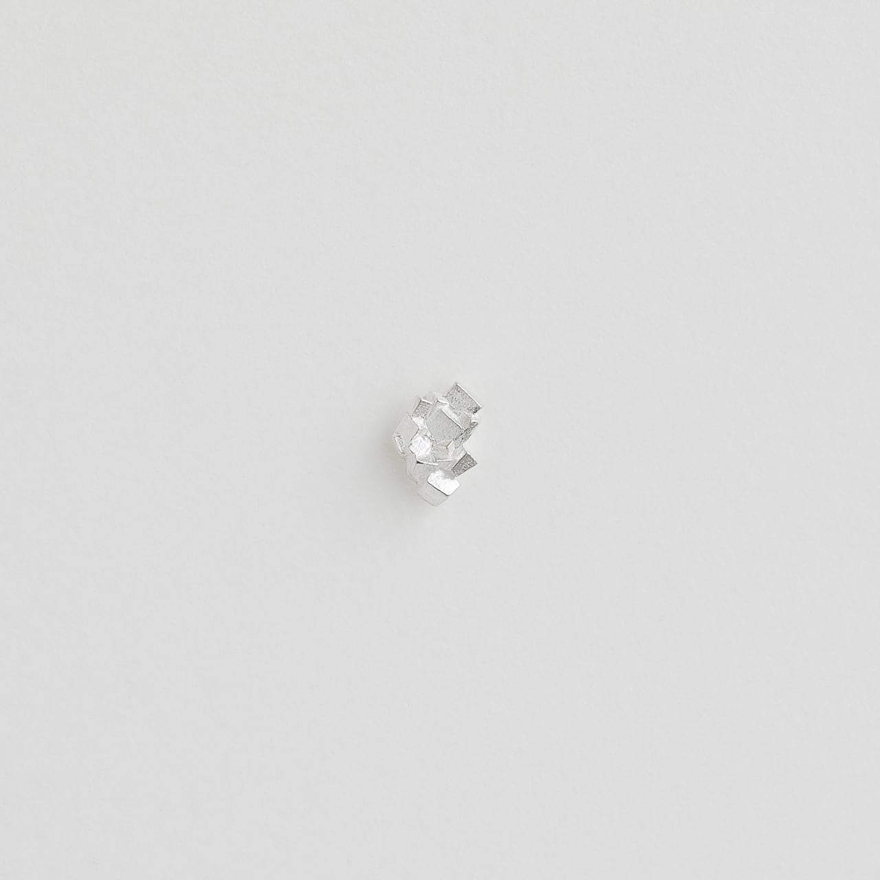 沢山の小さい立方体を組み合わせたような形状のため光の当たり方によって陰影がくっきりと生じ、着けるとしっかりとした存在感が感じられます。一見すると、具体的な何かのモチーフを思わせるというより幾何学的な印象。そのため、合わせる装いもあまり選ばず毎日のようにお使いいただけるアイテムです。